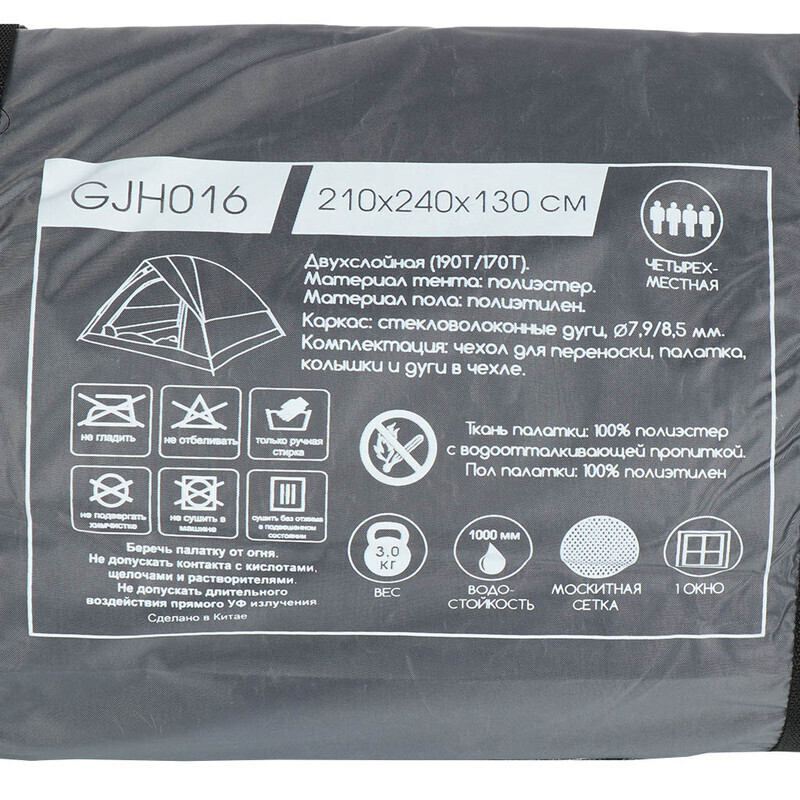 Рекомендуется ручная стирка и сушка без отжима в подвешенном состоянии. Запрещается: гладить, отбеливать, подвергать химчистке, сушить в стиральной машине. Берегите палатку от огня. Не допускайте контакта с кислотами, щелочами и растворителями.