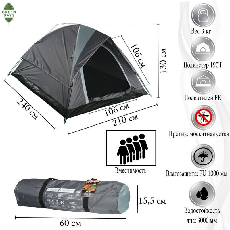 Вы можете приобрести «Палатка 4х-местная, 240х210х130 см, 2 слоя, 1 комн, с москитной сеткой, 1 вентиляционное окно, Green Days, GJH016» и другие товары в нашем интернет-магазине в Воронеже по низким ценам и с бесплатным самовывозом.