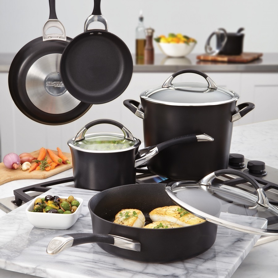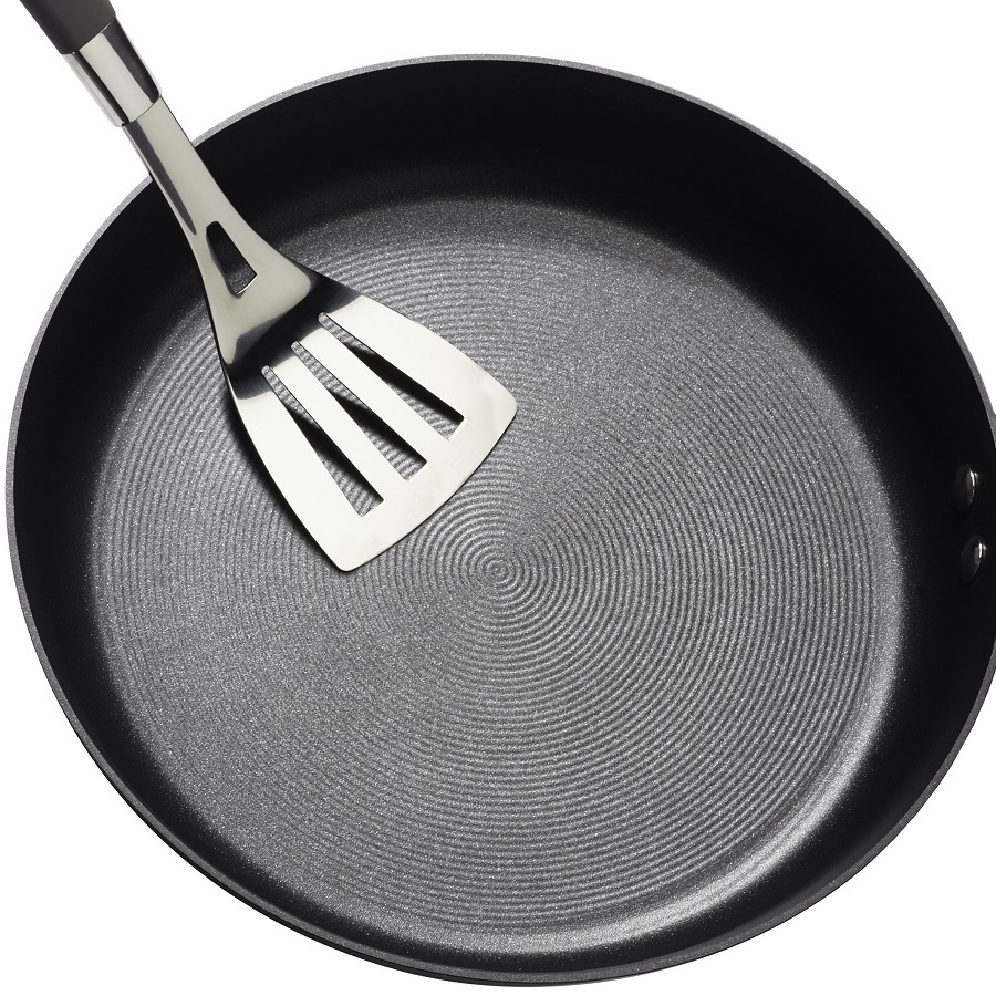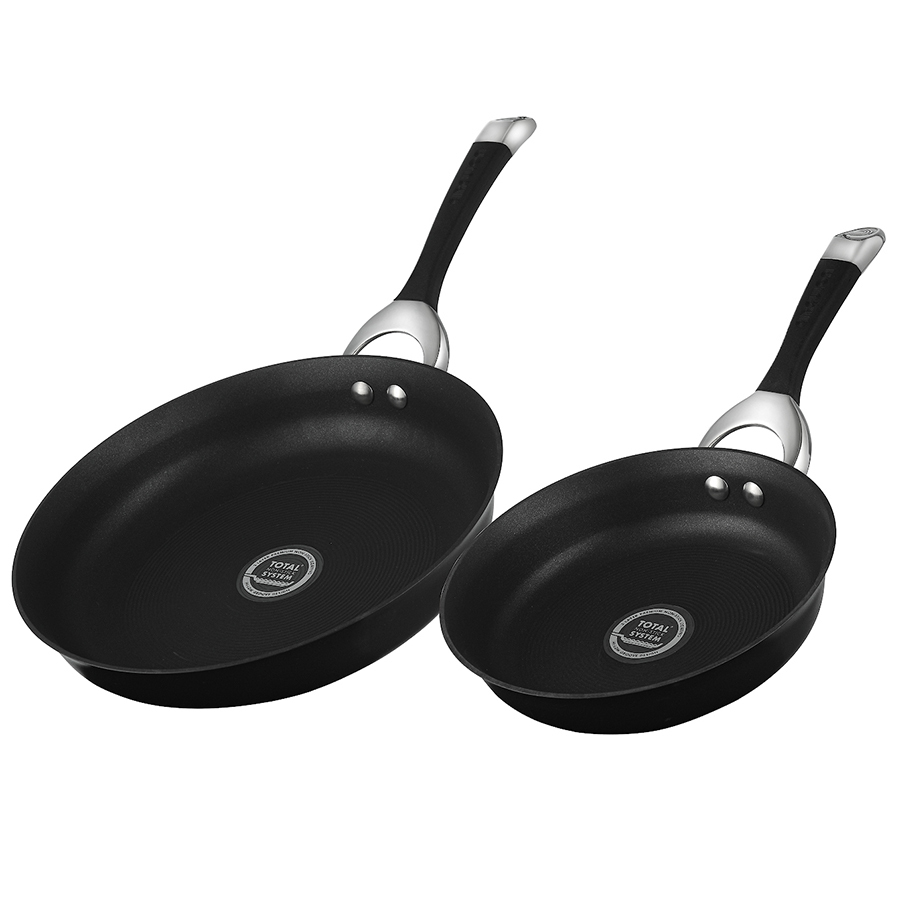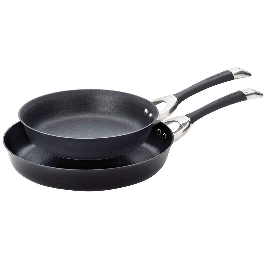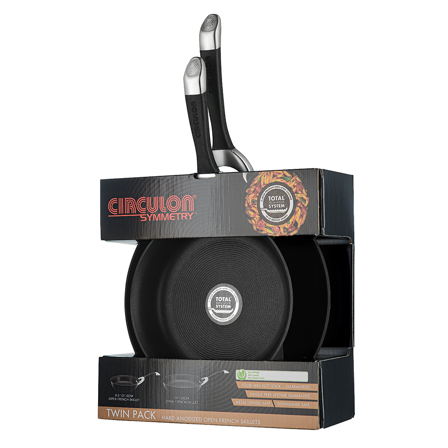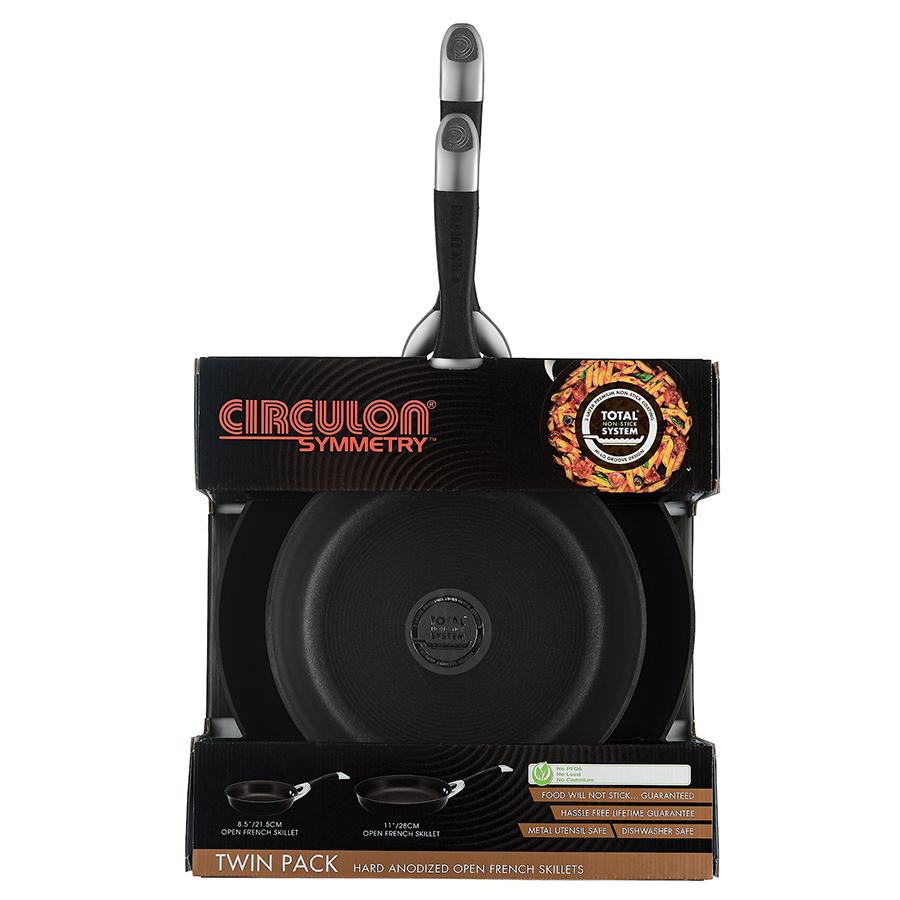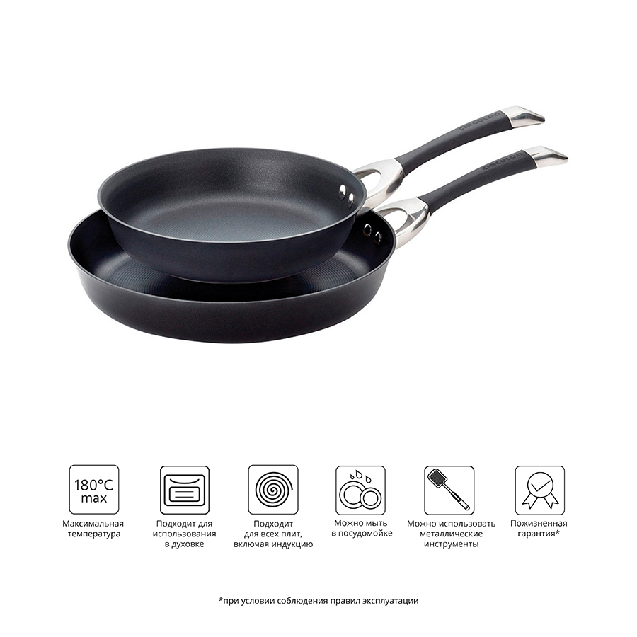 Набор сковородок — ценное пополнение коллекции посуды для создания кулинарных шедевров! Сковорода поменьше отлично подойдет для приготовления завтраков, например, яичницы, омлета ил блинов. На сковороде с большим диаметром можно обжаривать овощи, мясо, птицу, рыбу и другие блюда. Благодаря уникальной технологии бренда Circulon, блюда сохранят все полезные и вкусовые качестве во время приготовления. Особенности: - диаметр 21 и 28 см - выдерживает температуру до 180° - надёжное 3-слойное антипригарное покрытие - можно мыть в посудомоечной машине - подходит для любых видов плит - допускается умеренное использование металлических лопаток и ложек Symmetry — коллекция кастрюль, сотейников и сковород, которые незаменимы на любой кухне. Главные характеристики этой линейки: стильный дизайн и эргономичность. Корпус посуды выполнен из 3-х слоёв: внутренний из нержавеющей стали, средний из алюминия и внешний из анодированного алюминия. 3-х слойная технология способствует равномерному распределению жара по всей поверхности. Поверхность дна оснащена 2 дополнительными слоями: из алюминия и нержавеющей стали. Анодированный алюминий - исключительно износостойкий материал, достигается это изменениями на молекулярном уровне: материал погружается в электролит, и под высоким напряжением на его поверхности образуется оксид. Процесс анодирования делает металл более твердым и менее пористым. Фактически, такой алюминий в два раза прочнее нержавеющей стали. Поверхность дна оснащена 2 дополнительными слоями: из алюминия и нержавеющей стали. Эргономичные ручки из нержавеющей стали с силиконовым покрытием не нагревается во время готовки. Посуда подходит для всех видов варочных поверхностей, включая индукционные плиты. Запатентованная технология TOTAL® обеспечивает отличные антипригарные свойства и долгий срок службы. Внутри и снаружи посуда покрыта 3-слойным антипригарным покрытием, которое не содержит PFOA и устойчиво к повреждениям даже от металлических кухонных инструментов. Кольцевое рифление на дне обеспечивает дополнительный антипригарный эффект: площадь прилипания у такой поверхности меньше. Не рекомендуется перегревать посуду и долго готовить на высоких температурах, превышающих температурные ограничения - это повреждает антипригарное покрытие и делает его уязвимым к повреждениям. В процессе эксплуатации допускается умеренное использование металлических инструментов. Но при этом не рекомендуется прилагать чрезмерные усилия, например: резать ножом или усиленно чистить металлическими губками. На посуду Circulon предоставляется пожизненная гарантия при соблюдении правил эксплуатации. Технические характеристики сковороды 21 см: - толщина стенок: 2,5 мм - толщина дна: 3,4 мм - высота стенок: 4,5 см - диаметр дна: 15,9 см Технические характеристики сковороды 28 см: - толщина стенок: 2,5 мм - толщина дна: 3,4 мм - высота стенок: 5 см - диаметр дна: 18,3 см