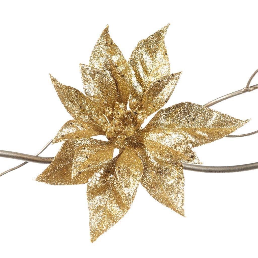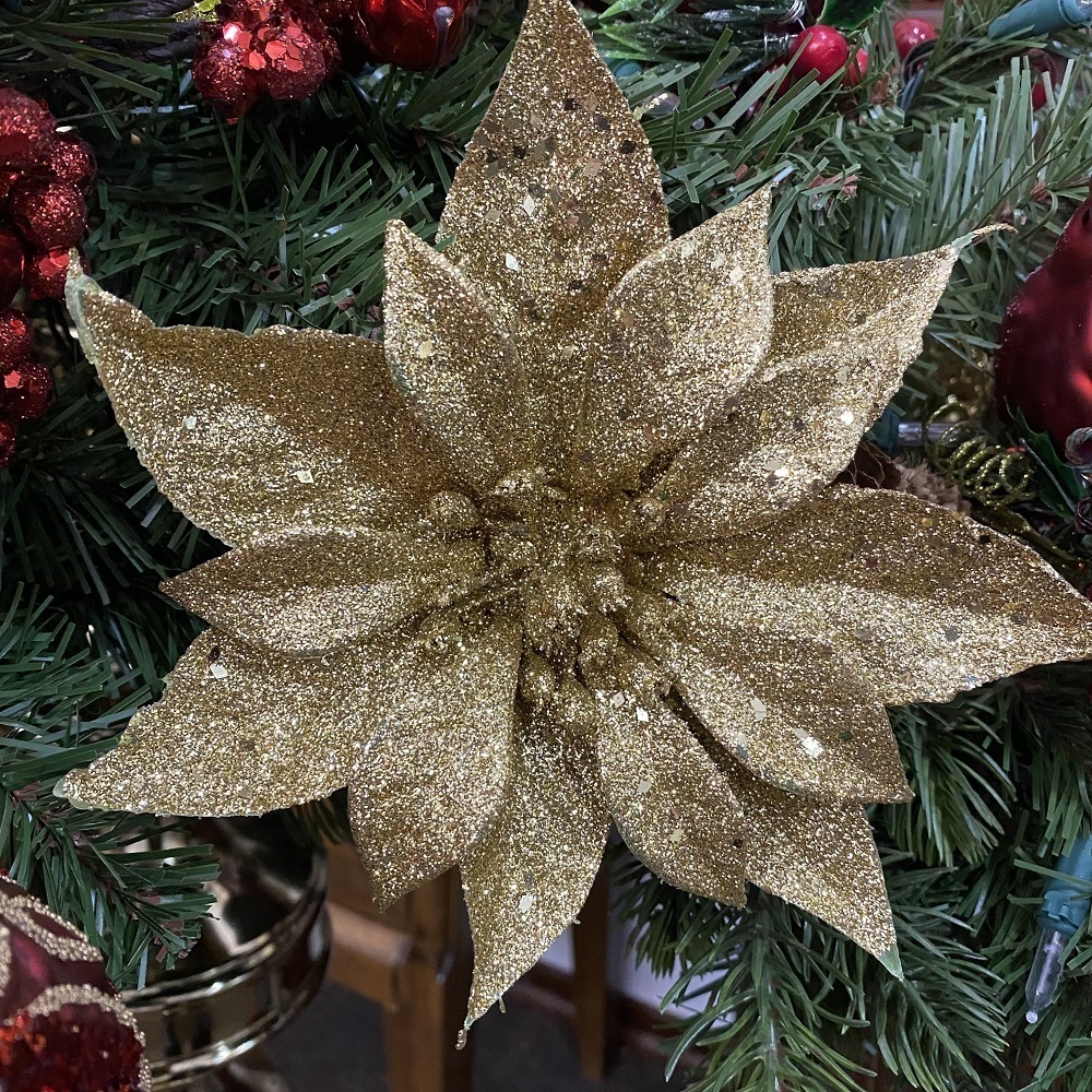 Цветок декоративной пуансеттии станет изысканным украшением Вашего новогоднего праздника. Золотой цветок в классическом стиле украшен чёрными и золотыми блёстками и выглядит, как настоящая драгоценность. Крепится к ветке с помощью клипсы.