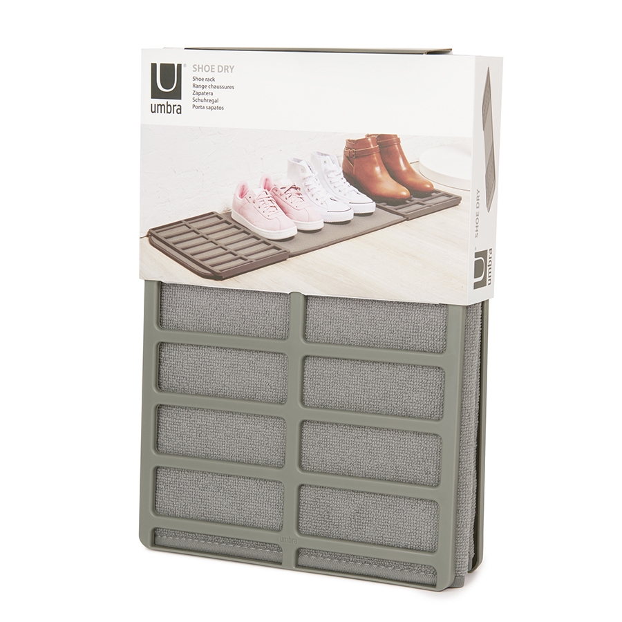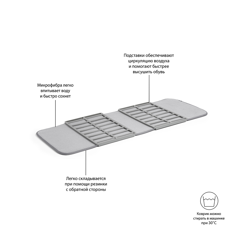 Удобный коврик-сушилка для обуви из ультра-абсорбирующей микрофибры — это стильное и современное решение проблемы мокрой обуви. Практичный аксессуар поможет сохранять обувь и пол в прихожей сухими. Коврик легко складывается и раскладывается, на нём также есть две специальных подставки для сильно промокшей обуви. Дизайн: Eugenie de Loynes и David Green