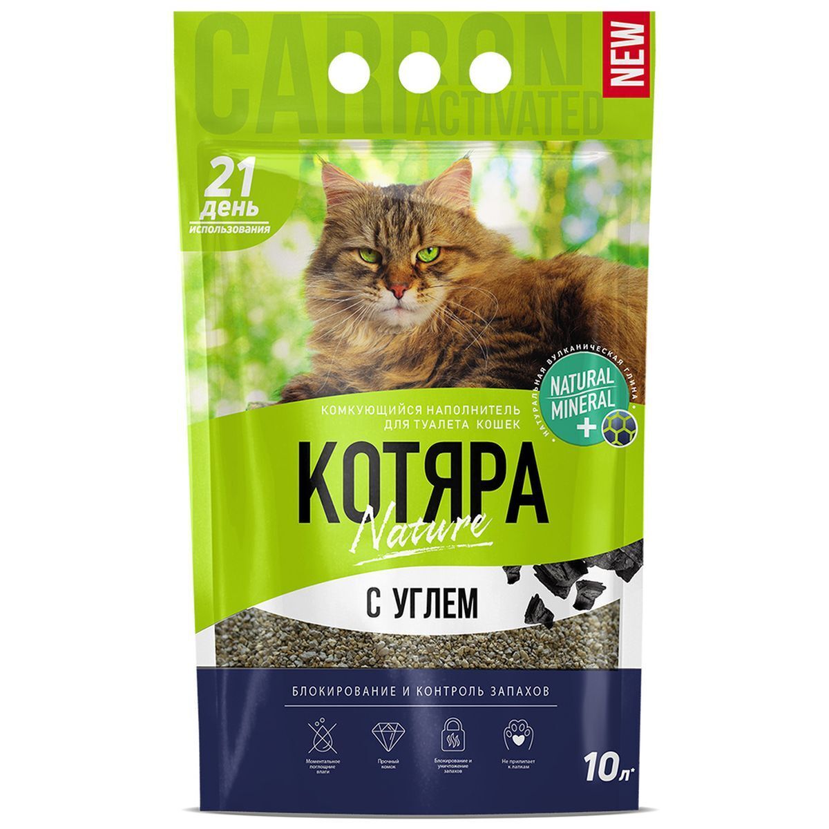 Комкующийся наполнитель Котяра с активированным углем обладает отличными адсорбирующими свойствами. Благодаря пористой структуре активированного угля эффективно борется с неприятными запахами, усиливая действие бентонитовых глин. Специально подобранный размер гранул, не ранит лапки животного и не прилипает к шерсти.
