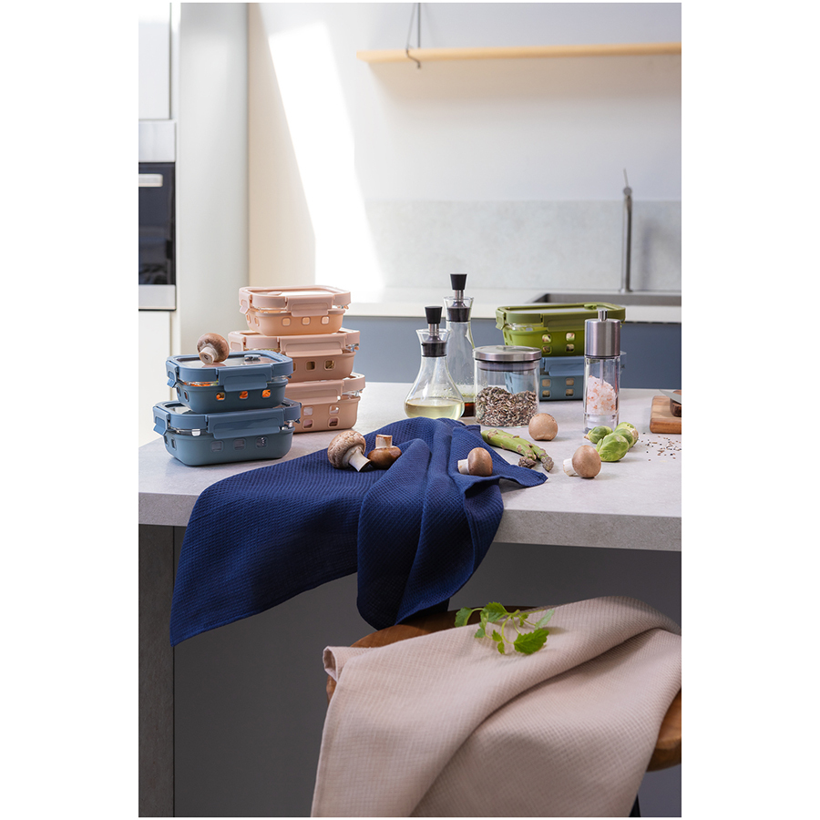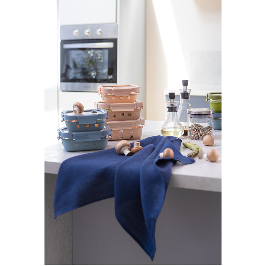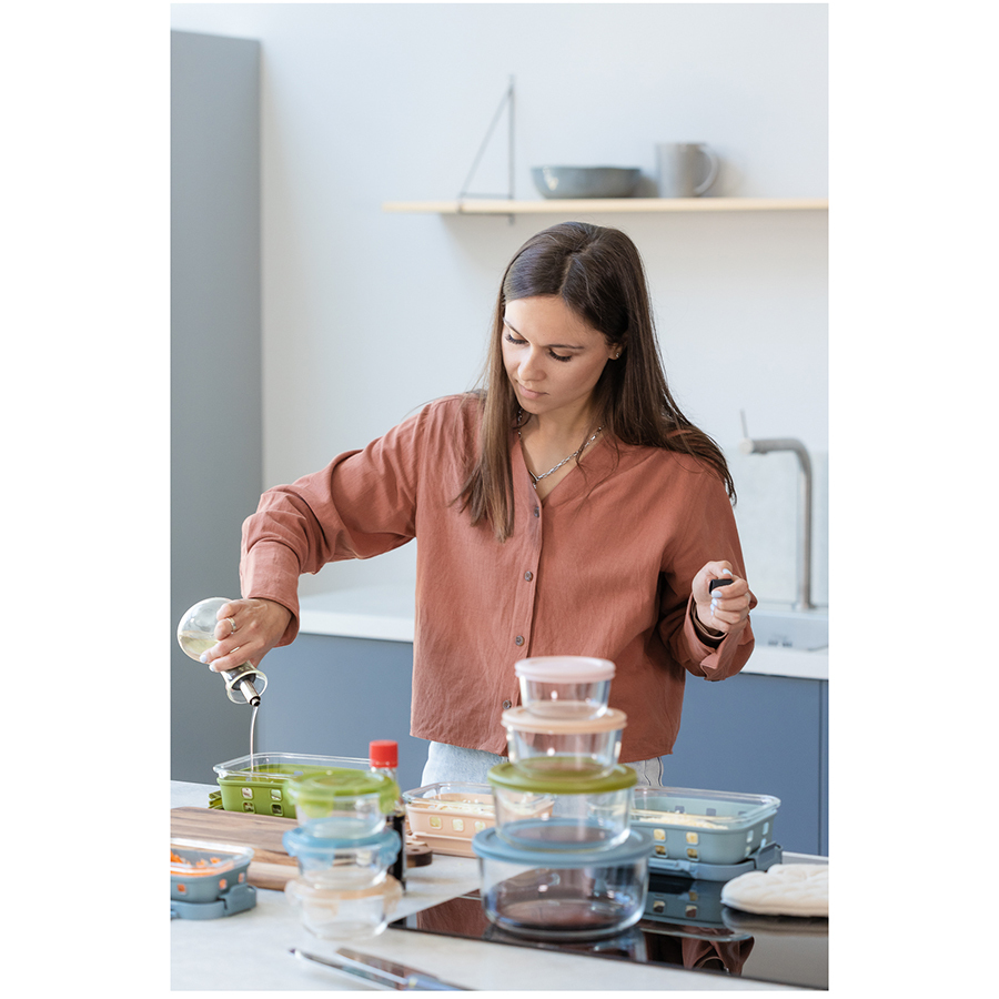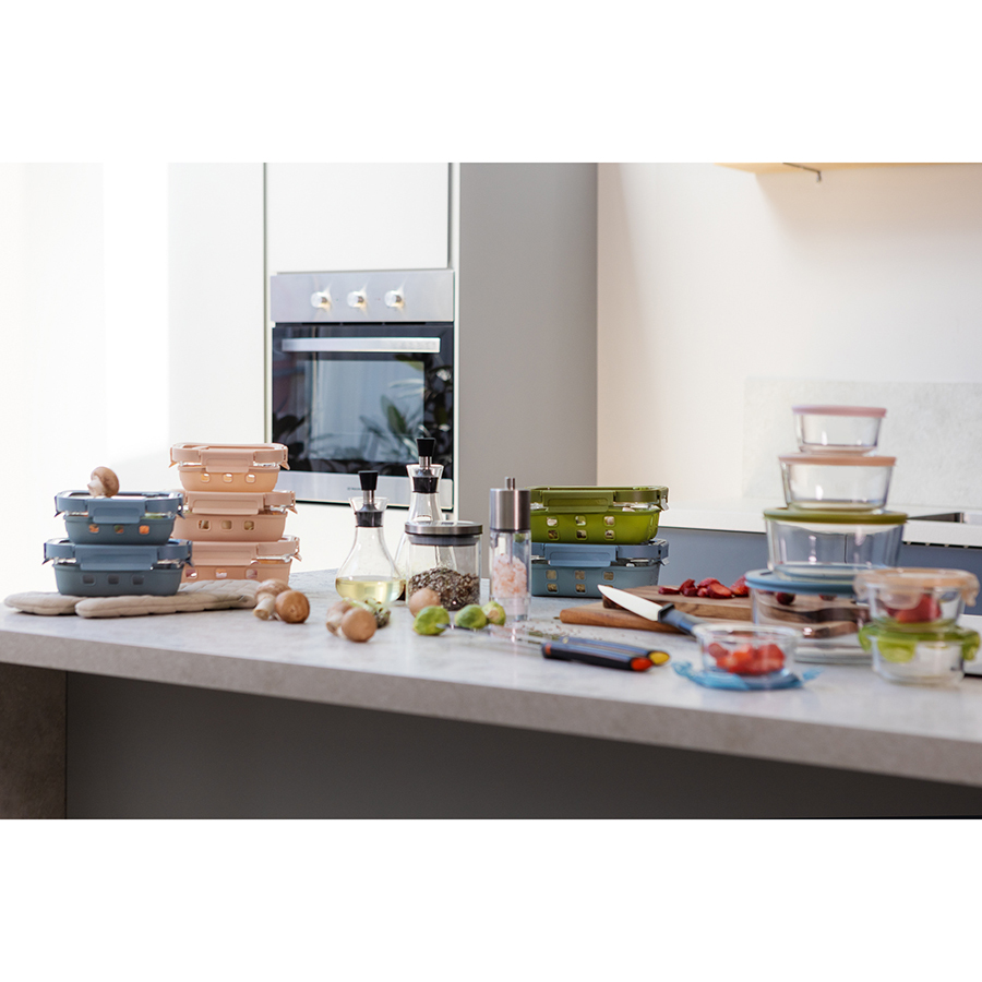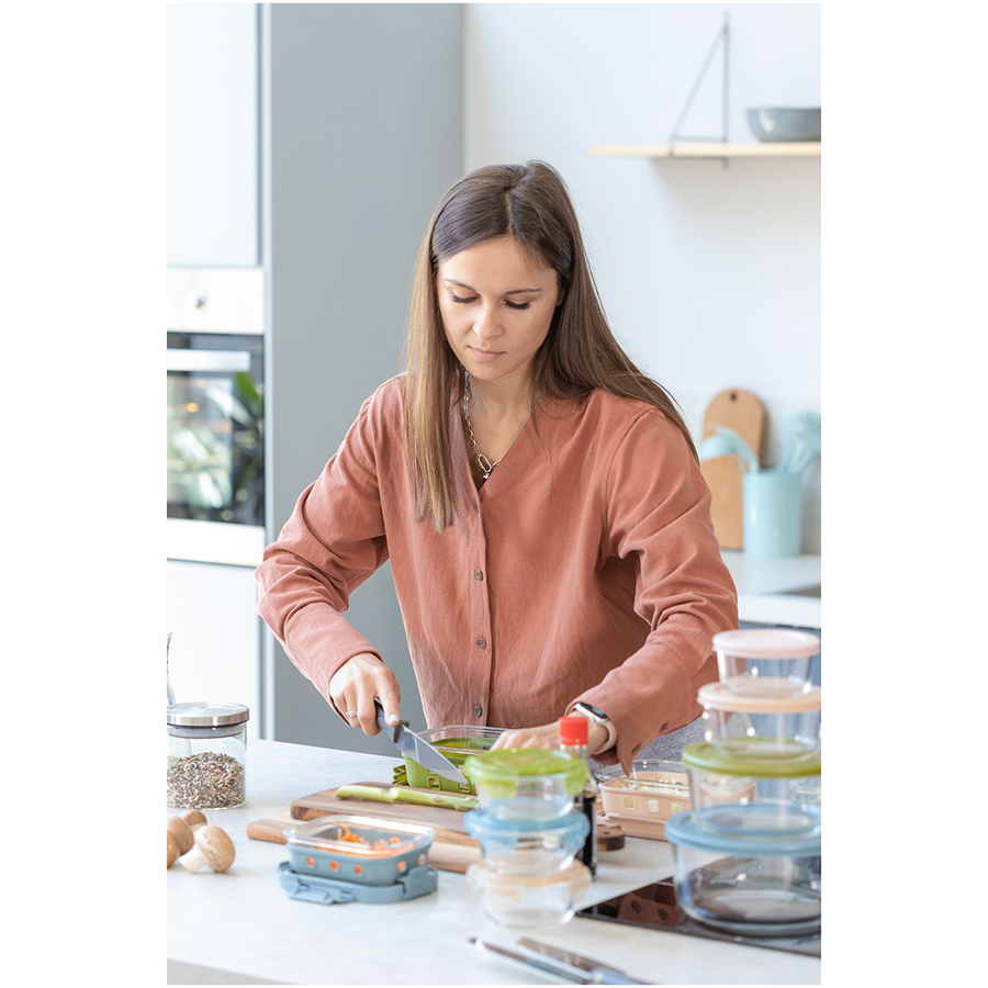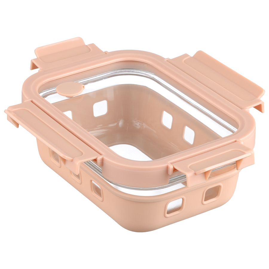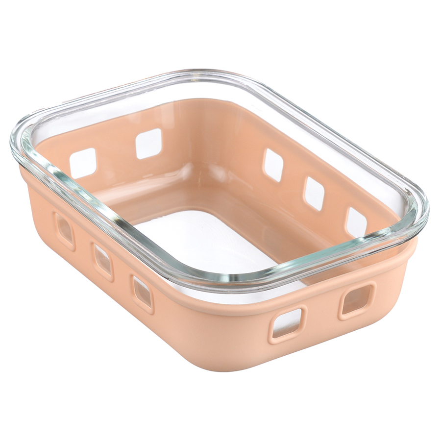 Контейнер стеклянный в чехле из силикона отлично подходит для хранения, запекания и транспортировки продуктов, в том числе готовых блюд. Емкость из боросиликатного стекла не впитывает запахи и загрязнения, легко моется. Крышка с надежными пластиковыми замками на каждой стороне обеспечивает плотное закрывание. Материалы не содержат бисфенол-А и являются абсолютно безопасными для здоровья. Наличие специального вентиляционного отверстия позволяет выпустить лишний воздух или горячий пар, что повышает герметичность и улучшает условия хранения продуктов. Силиконовый чехол без труда снимается для более тщательной очистки контейнера.
